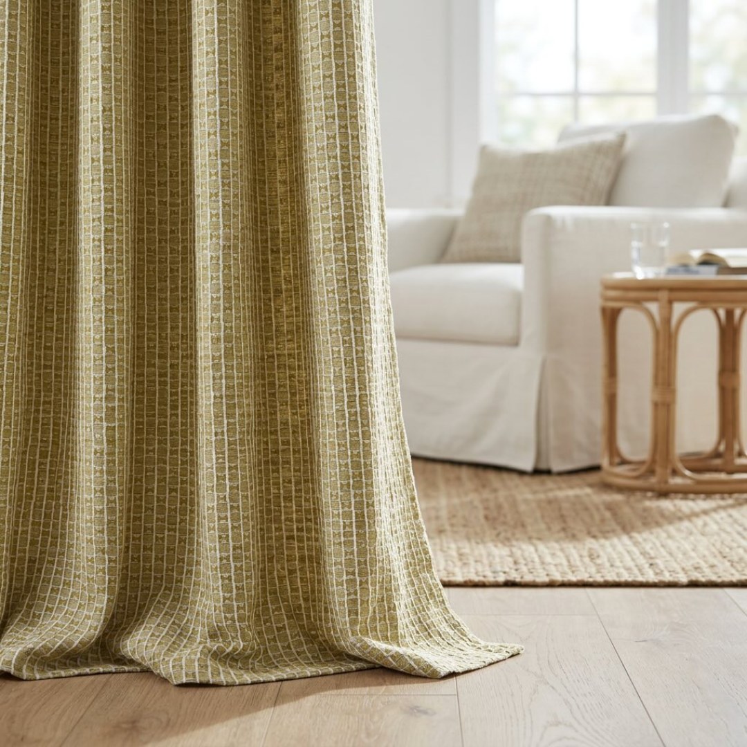 The Nature’s Grid collection features a premium linen-cotton blend with a dimensional waffle-weave that balances architectural structure and organic softness. This textured fabric provides a tailored, light-filtering drape that adds organic warmth and a clean, geometric edge to any rustic or contemporary interior.
