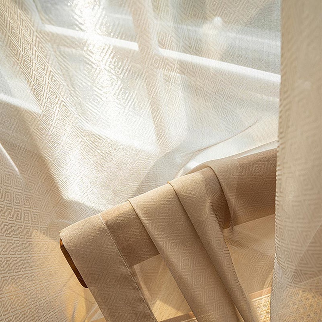 Effortlessly elegant, this organza voile features a subtle diamond pattern that catches the light with refined shimmer. Its contemporary geometric design brings modern sophistication and understated visual interest to any space.