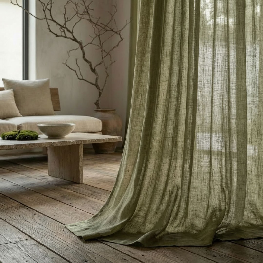 Wabi Sabi Pure Flax Linen Olive Green Voile Curtain