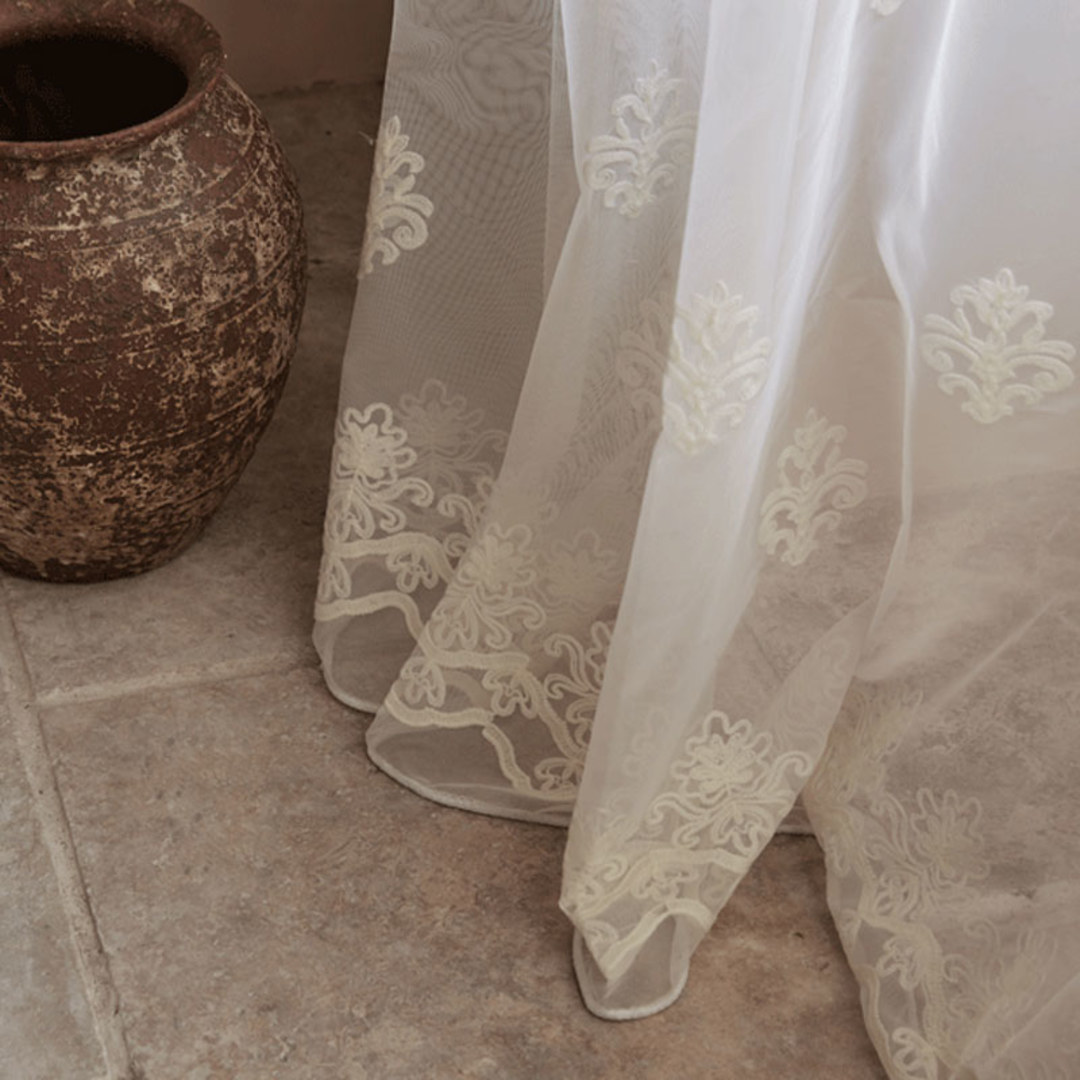 Let the natural light shine through with this beautiful soft embroidered tulle curtain.