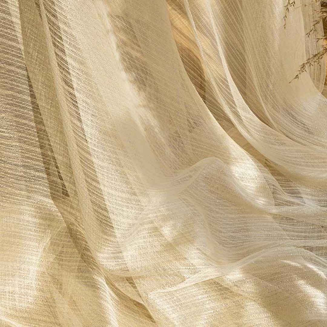 These delicate mesh sheers feature subtle vertical glitter stripes, bringing a refined sparkle to any room. Light and airy, they softly filter sunlight while adding modern elegance and visual interest, making them a versatile choice for a variety of contemporary interiors.
