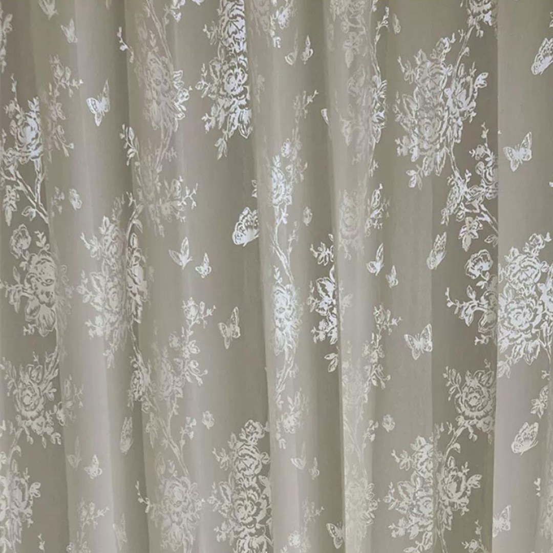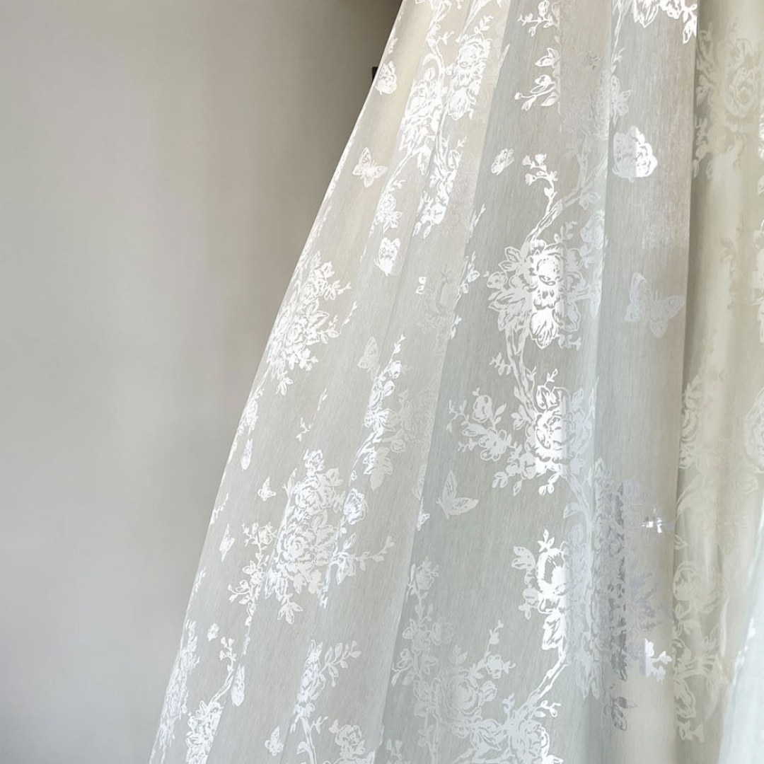 This sheer curtain fabric features an elegant floral pattern with intricate details of roses, branches, and butterflies.