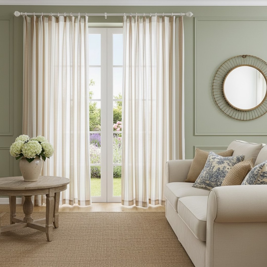 Elevate your windows with the Sunnyside collection, featuring a soft, tactile linen-blend texture and a simple, elegant classic stripe design. These sheer curtains beautifully filter light to create a warm, inviting atmosphere that perfectly complements farmhouse, coastal, Mediterranean, and French country styles. Their gentle drape provides a timeless, organic accent for any room.
