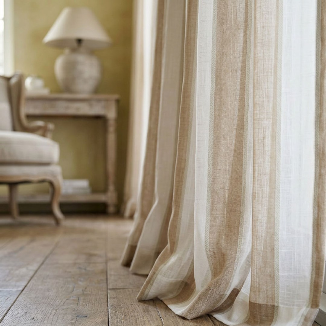 Elevate your windows with the Sunnyside collection, featuring a soft, tactile linen-blend texture and a simple, elegant classic stripe design. These sheer curtains beautifully filter light to create a warm, inviting atmosphere that perfectly complements farmhouse, coastal, Mediterranean, and French country styles. Their gentle drape provides a timeless, organic accent for any room.