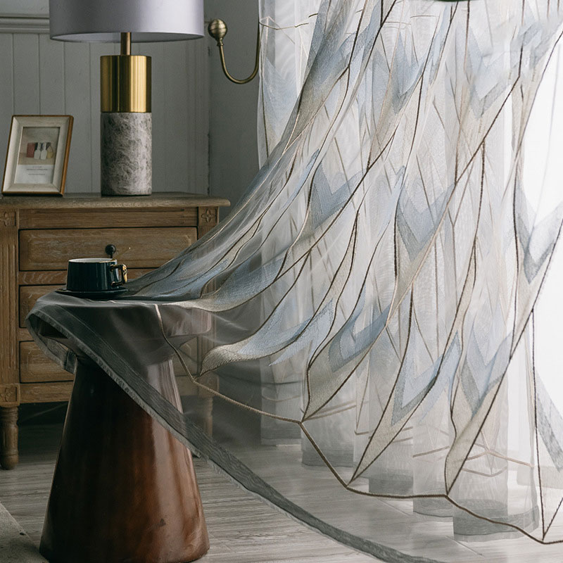 Geometrica Embroidered Sparkling Blue Gold Grey Voile Curtain