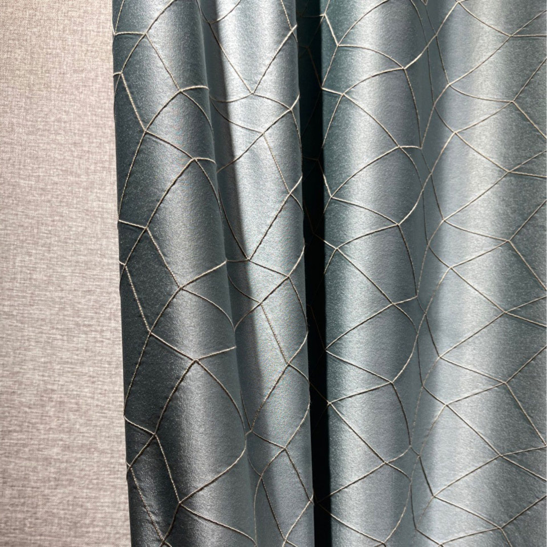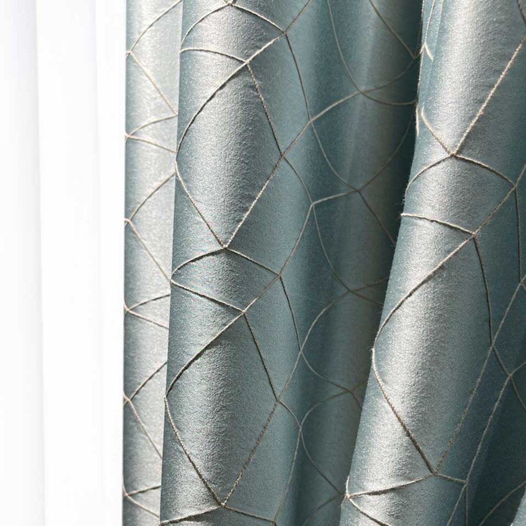 A contemporary abstract geometric design in duck egg blue with textured 3D jacquard weave, adding depth and modern elegance to any room.