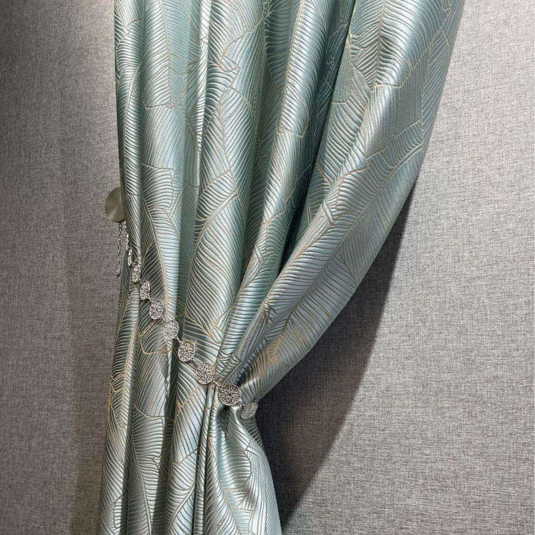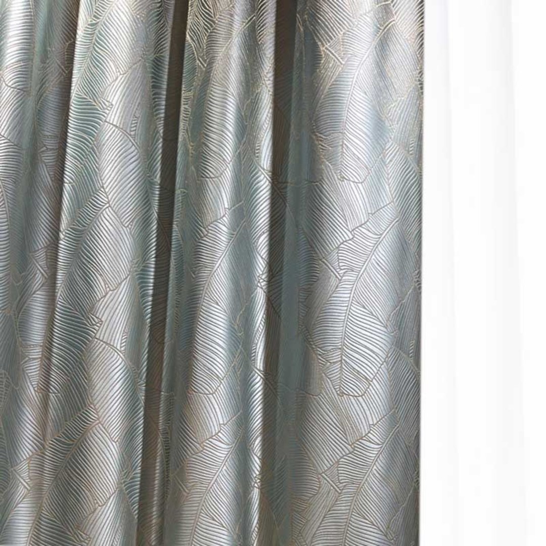 Luxurious 3D jacquard curtains with an elegant banana leaf motif and subtle gold accents, bringing contemporary sophistication and natural flair to modern interiors.