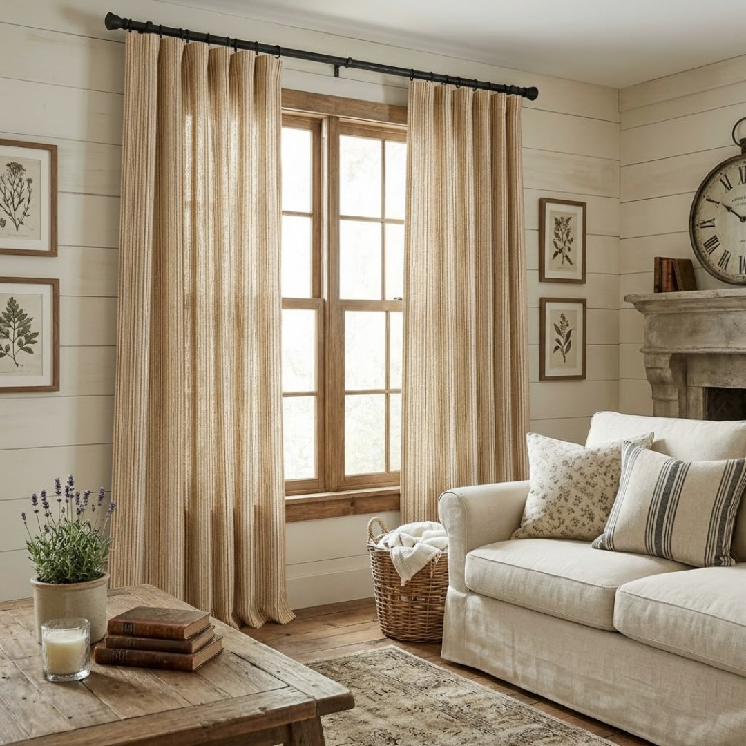 Cottage Flax brings timeless warmth to your home with a premium blend that balances the soft comfort of cotton with the rustic, textured character of linen. This substantial fabric offers a structured, elegant drape that provides both privacy and beautifully filtered light, creating an inviting "modern farmhouse" feel in any room.