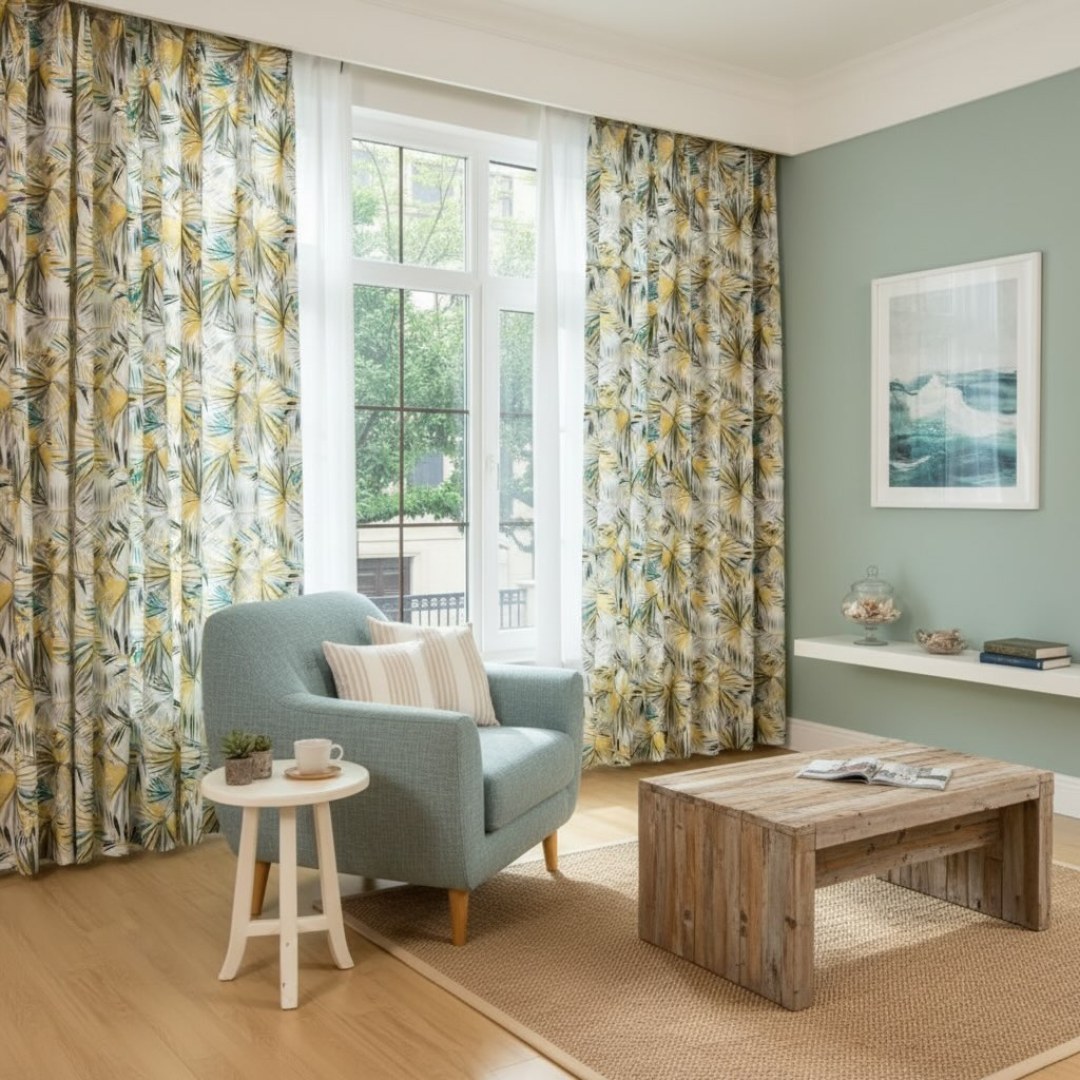 Palm Delight tropical leaves green blue curtain showcases a tropical leaf pattern in refreshing shades of green and blue, creating a tranquil and invigorating atmosphere. The intricate detailing of the leaves brings a touch of tropical elegance to your space, allowing you to embrace the serenity of a lush oasis.