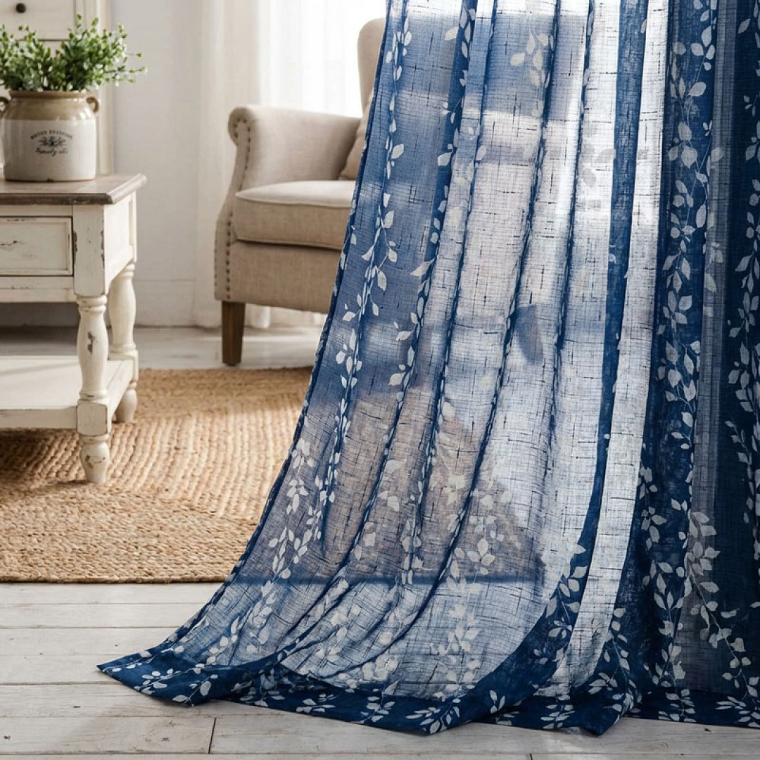 Pascal Navy Blue Vine Print Semi Sheer Voile Curtain