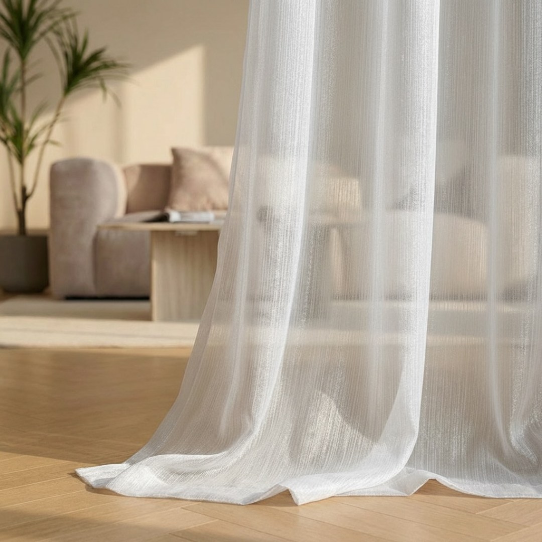 Lightweight organza voile curtains with a vertical striped weave and subtle shimmer, adding texture and movement to any interior. Softly filtering natural light, they create an airy, elegant ambiance.