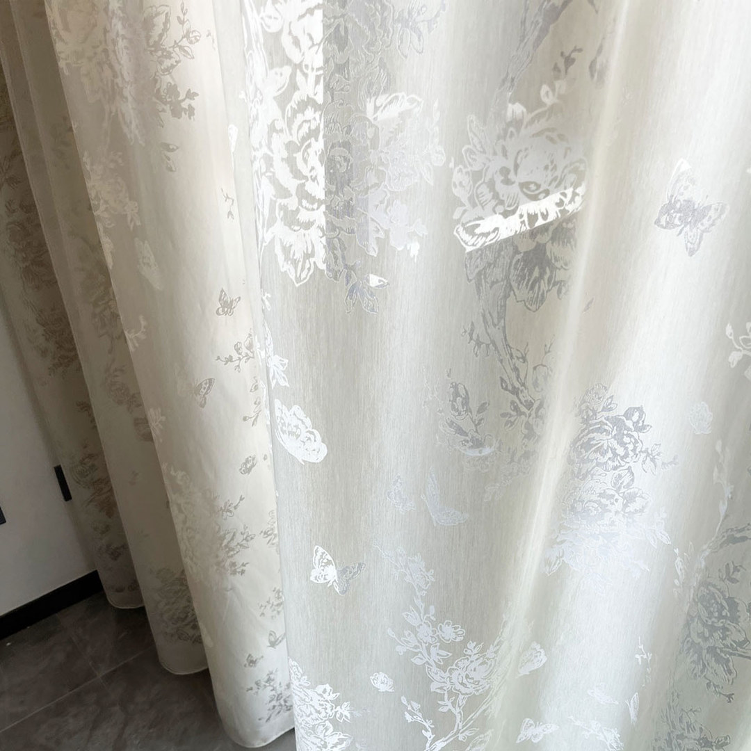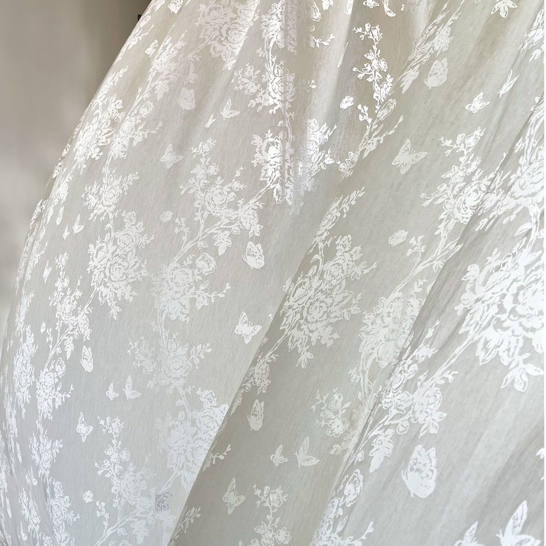 This unique sheer fabric features an elegant floral pattern with intricate details of roses, branches, and butterflies. The semi-transparent texture softly filters light while adding a graceful floral accent, perfect for classic and airy interiors