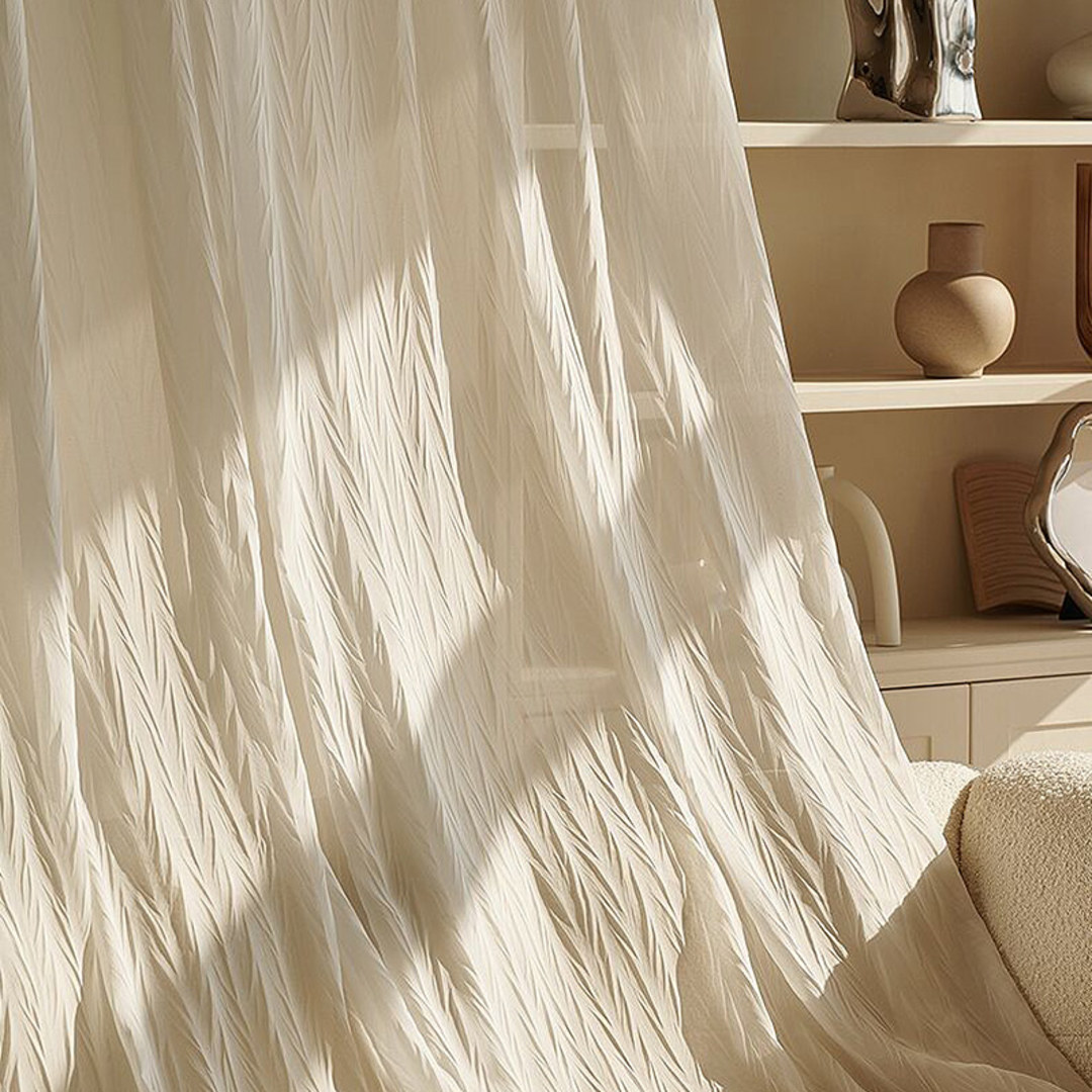 Ethereal Crinkle voile curtains feature lightweight voile with permanent crinkled texture, softly diffusing light for a dreamy glow and gentle privacy. The subtle pleats add elegant movement and depth, draping beautifully to elevate any space with effortless sophistication. Easy-care and timeless.